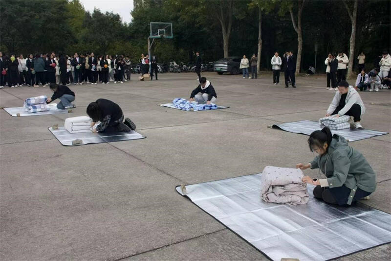 致辞结束后,各项活动有序开展。作为核心环节的叠被大赛中,参赛学子们精神饱满、动作利落。铺平床单、压实被芯、精准对折、棱角塑形,一系列操作行云流水,原本松散的被子很快被打造成方方正正、线条分明的 “豆腐块”,充分展现了放射学院学子严谨细致的生活态度与扎实的生活自理能力。评委团依据平整度、方正度、美观度等标准进行专业评审,现场打分并公布结果,让比赛既公平公正,又充满竞技乐趣。