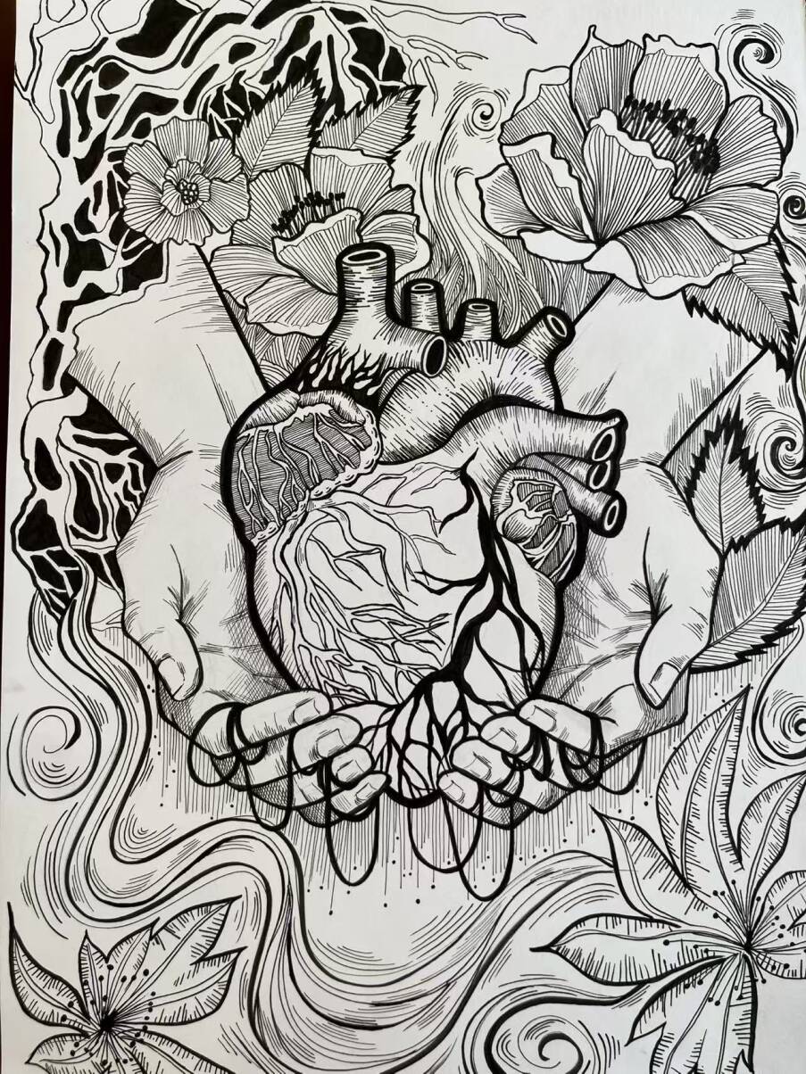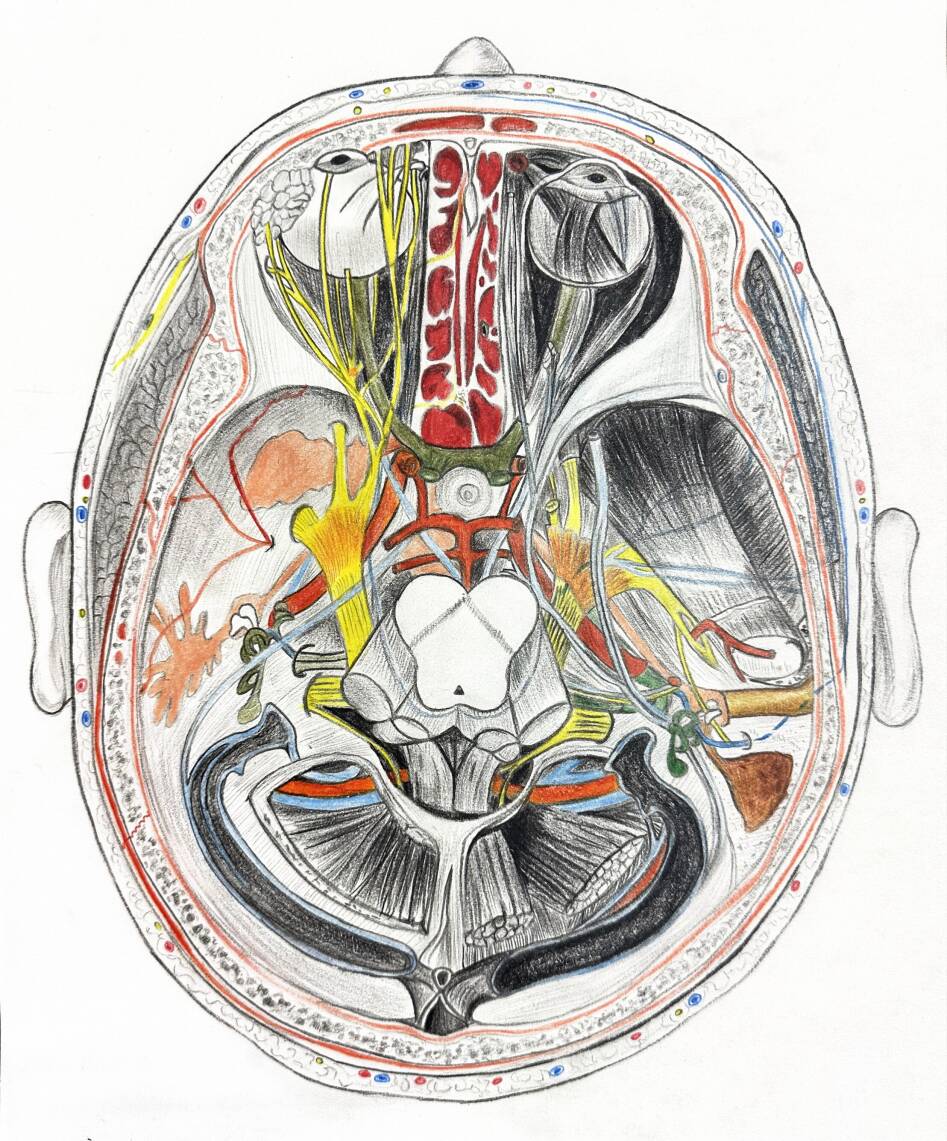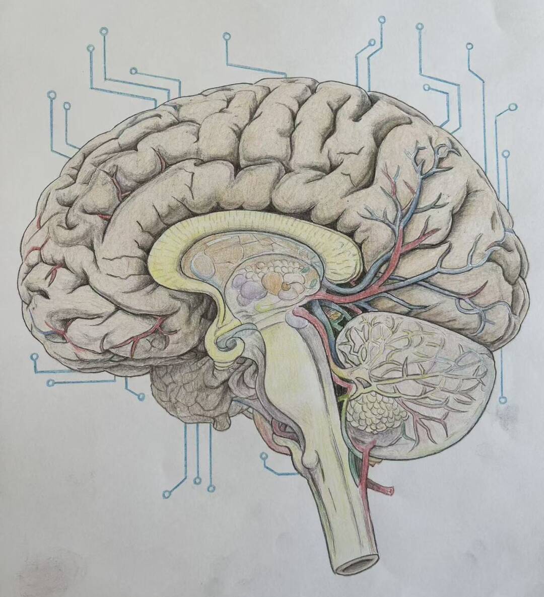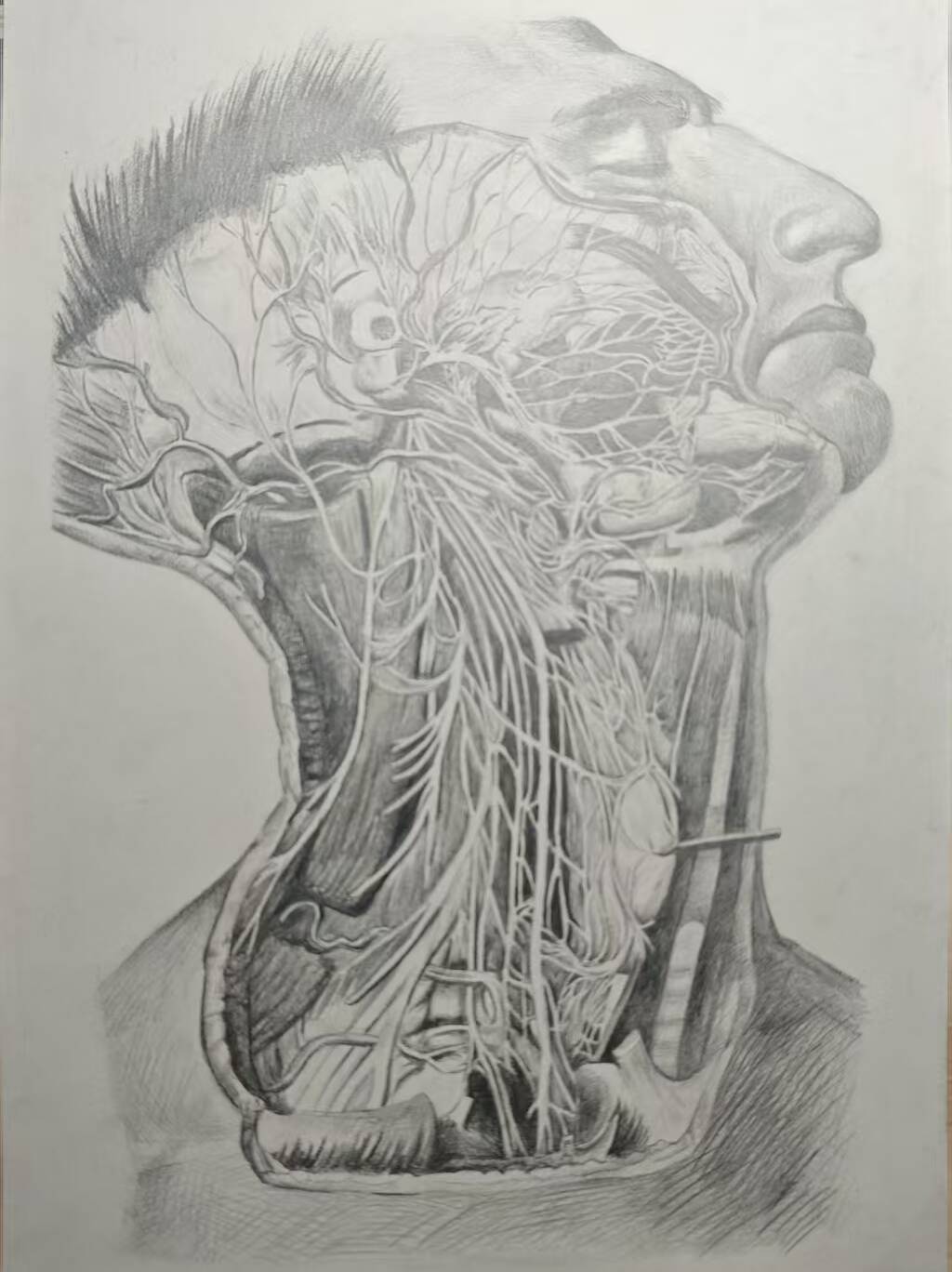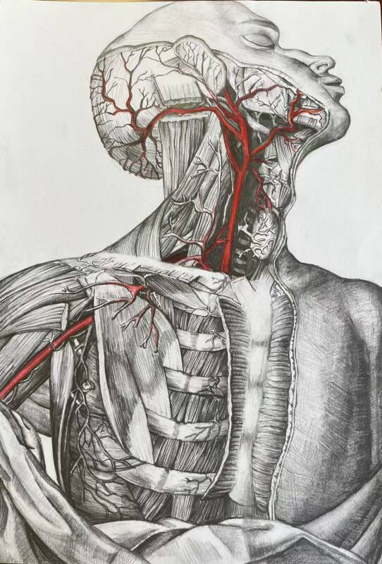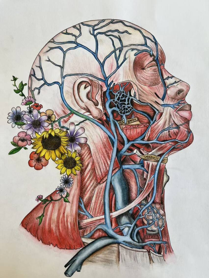 头颈部是我们在接触系解旅途中最先接触的部分,因此有很多同学从其中入手,向我们展示了这份学科羁绊的渊源。他们或是用写实的手法精确地表达了血管神经的细致结构,或是在基础的创作过程中加入了更具生命力的意象,展示生命之美。这让我们感受到同学们对于解剖学学习的动力与决心,也让我们感受到新时代山一大人旺盛的生命活力。