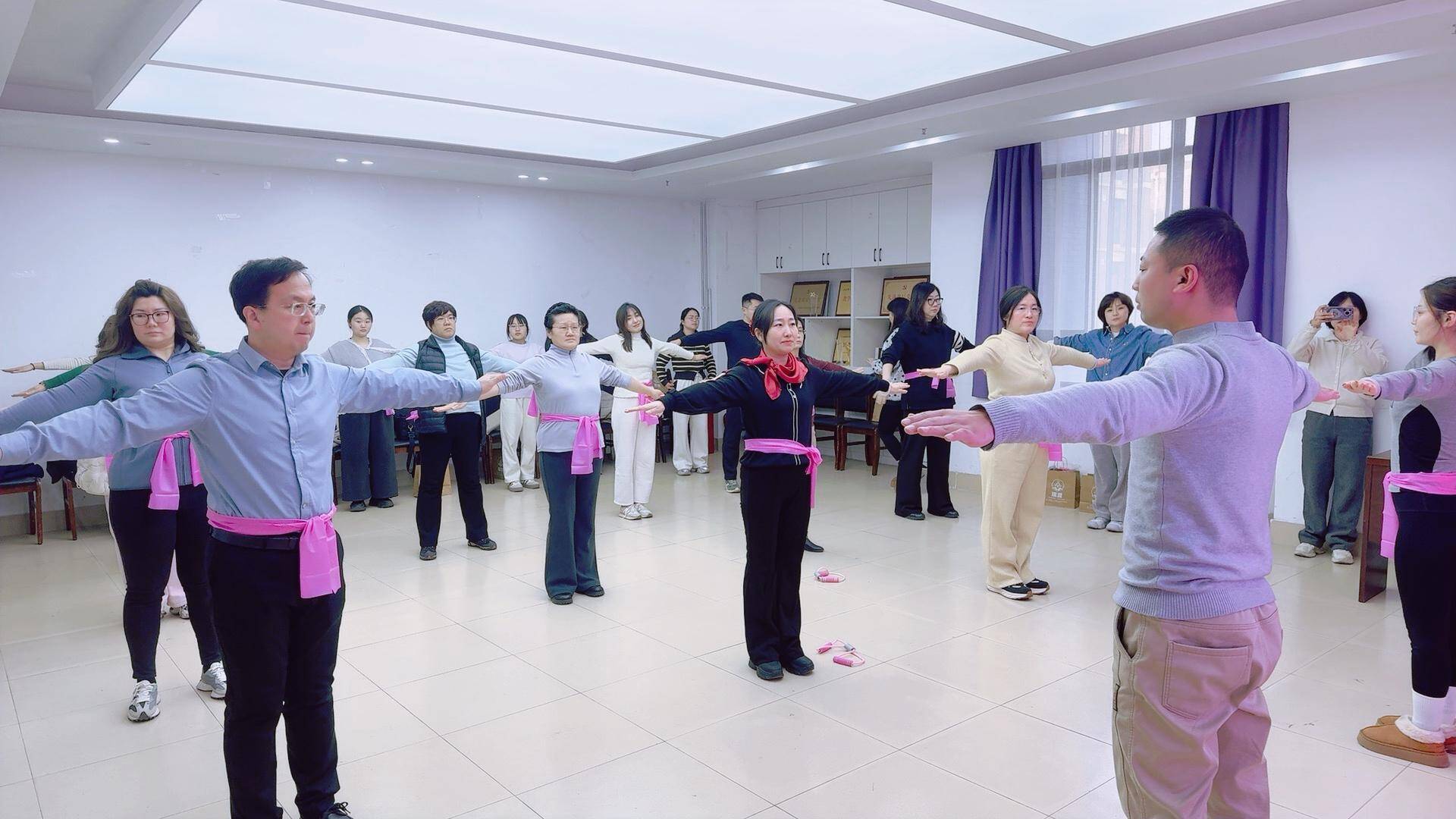 活动过程中,专业瑜伽教练以“科学拉伸·精准疗愈”为核心,采用PPT理论讲解与现场示范跟练相结合的方式,为大家带来了一场兼具专业性与疗愈感的身心之旅。在练习中,老师细致讲解了肩颈放松、体态调整的核心原理与动作要点,随后亲身示范,引导教职工借助弹力绳、开肩环等专业工具,循序渐进地完成了一系列针对性的拉伸与舒展动作,每一个动作都在老师的耐心指导下变得精准而有效。大家屏气凝神,在一呼一吸间感受身体的细微变化,紧绷的肩颈逐渐舒展,疲惫的身心慢慢松弛。在沉浸式的瑜伽体验中,老师们暂时放下了工作的压力与繁琐,专注于当下的呼吸与舒展,在舒展的体式中沉淀自我、疗愈身心,现场氛围轻松愉悦,充满了温暖与活力。