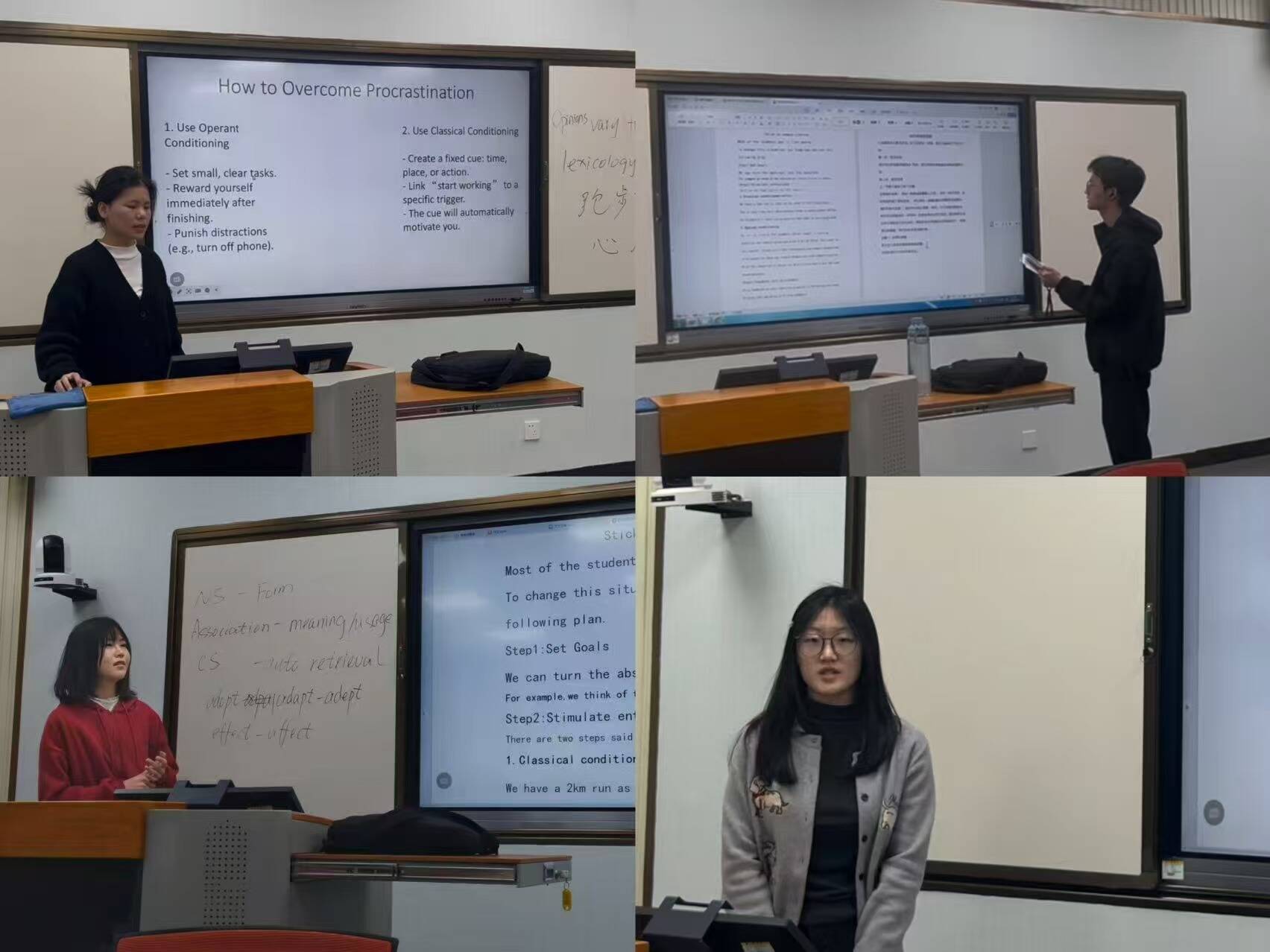 在学生展示之后,两位老师分别从语言和心理学角度给出了指导。那明老师从英汉两种语言的主要区别出发,引出形合与意合的概念,并结合同学们的英语表达不当之处进行了举例说明。她还从句法角度纠正了同学们作业中目录部分的错误,并从词汇学角度提醒大家遇到同义词时要注意对“度”的衡量,力求用词准确。刘欣老师首先肯定了同学们借助心理学原理制定行动计划的做法。他指出:借助理论可以避免计划“凭感觉”的随意性,也可以提升计划实施的成功率。同时,他对作业中提及的经典条件反射原理的适用范围进行了明确,举例说明了哪些场景下利用该原理可以取得更好效果。最后,刘老师还提到了运动对大脑的重塑作用,让同学们感到十分新奇。